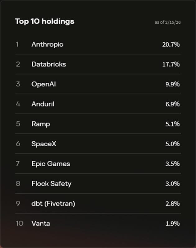 It has a portfolio of 22 private names including OpenAI, Anthropic, and Anduril. You can invest in them today for 1x NAV with only limited liquidity. After shares vest in two quarters following the fund’s IPO and listing under ticker VCX, you could get both daily liquidity and a shot at a premium (possibly an indefensible and temporary one) to NAV.