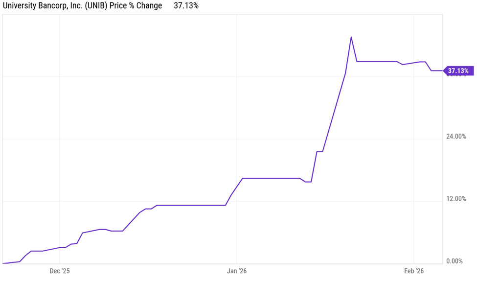 University Bancorp (UNIB) trades at ~85% of its tangible book value which is <5x last quarter’s earnings. Earnings can be choppy but core earnings appear to be running ~$2.50 a year on a ~$16.50 stock as of this writing…