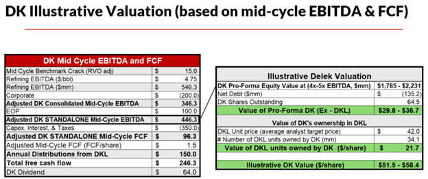 Delek (DK) costs less than $20 per share and owns about $25 per share of Delek Logistics Partners, LP Common Units (DKL). I squirm whenever management tells me what the stock is worth (I prefer operators’ eyes on the field than on the scoreboard), but this lays out the case fairly: