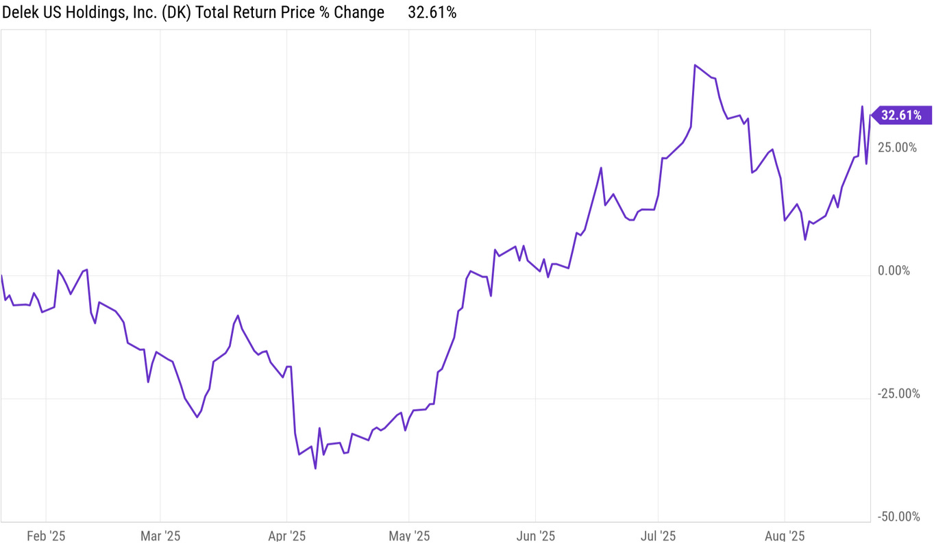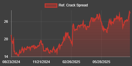 The 3:2:1 crack spread is the spot price for two barrels of gasoline plus the spot price for one barrel of heating oil minus the spot price for three barrels of WTI crude oil. It is an approximation of refinery profitability and it just hit a new 2025 high which is good for both DK and for CRAK.