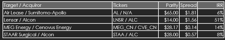 I hope and expect to get at least one or two bumps from this list. While we could also get at least one or two deal breaks, they are likely to be fairly benign as these deal premiums appear to be smaller than justified.